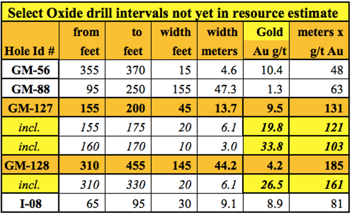 The main focus is next year’s new mineral resource estimate and a preliminary economic assessment (PEA). Only the near-surface oxide ounces will be considered in the PEA. Over 50 holes were drilled after the 2010 resource was published. Those holes, plus new holes from this year, will be added to the next resource. Some of the best historical drill intersections were reiterated in this recent press release.