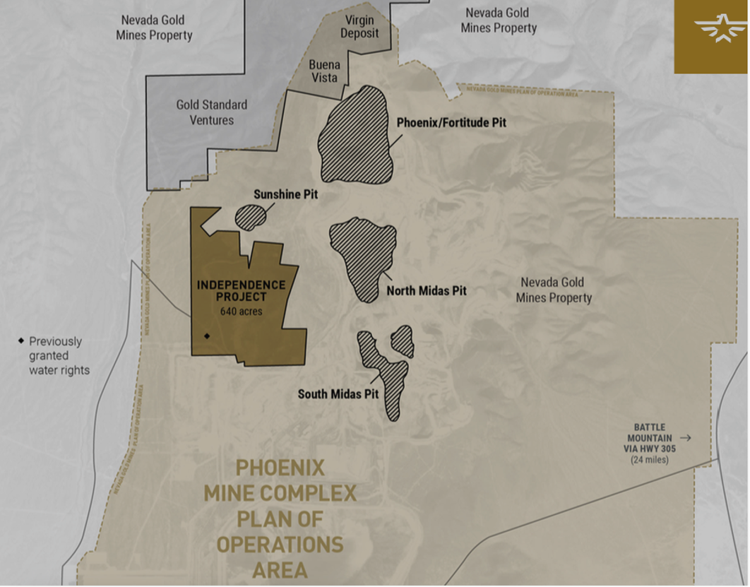 Golden Independence Mining Corp. (IGLD:CSE; GIDMF:OTCQB) is flying under the radar, with its flagship project in Nevada on property within Nevada Gold Mines’ (NGM; a joint venture between Barrick Gold Corp. [ABX:TSX; GOLD:NYSE] and Newmont Corp. [NEM:NYSE]) Environmental Impact Statement and Permitted Plan of Operations footprint. The Independence Gold project is just 0.5 km southwest and adjoins to NGM’s Phoenix-Fortitude mining operations in the Battle Mountain-Cortez trend.