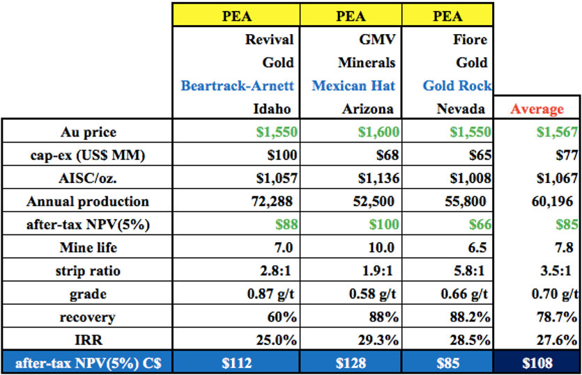 Based on recent gold junior PEAs, if we can model an initial heap leach mine at $1,550–$1,600/oz gold, and a seven- or eight-year mine life, at 50 or 60,000 ounces/year—that would be a small, but nicely profitable operation with ample room to grow. This is what we hope to achieve in a PEA as soon as the second half of next year, subject, of course, to the analysis of third-party consultants.