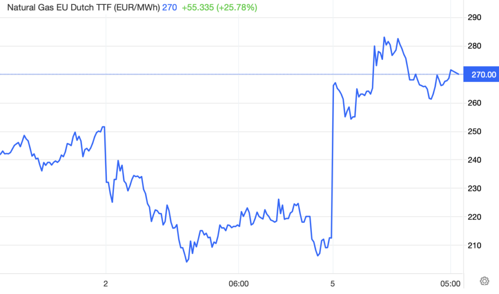 Trading Economics/Staff/9-5-2022 “TTF natural gas futures, the European benchmark jumped more than 30% to above €280 per megawatt hour on Monday, after touching a three-week […]