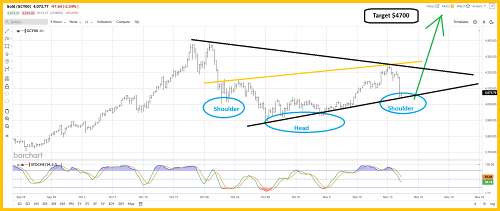Note the inverse H&S pattern and the bull triangle. These are both positive for gold, and both target the $4700 zone.