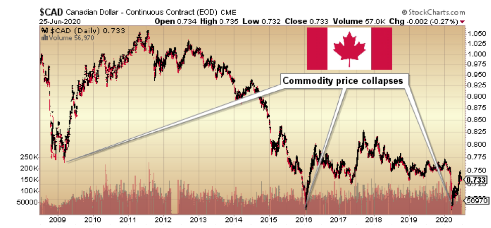 The Canadian currency has been on a roller coaster ride since the lows of 2009, and has been almost perfectly correlated to oil prices. But for Canadians, the significance of the CAD/USD relationship lies in how gold has responded since 2009, in light of the fact that neither the Bank of Canada nor the Canadian treasury owns as much as a single ounce of gold.