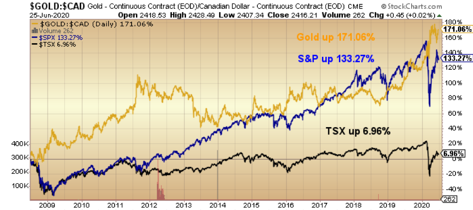 At the lows of Q1/2009, had the average Canadian sold all bonds and stocks and simply bought gold, he/she would be ahead 171.06% in that time frame. In the same period, the TSX is up a hair below 7%. The S&P 500 is up 133.27% in U.S. dollar terms, but a striking 215% when the currency gain is calculated.