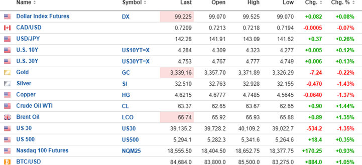 June gold futures (-0.22%) are down $7.24 to $3,339.16, May silver (+1.43%) down $0.47 to $32.510, May copper (-1.37%) down $0.0640 to $4.6215, but oil (+1.44%) is up $0.90 to $63.37/bbl.