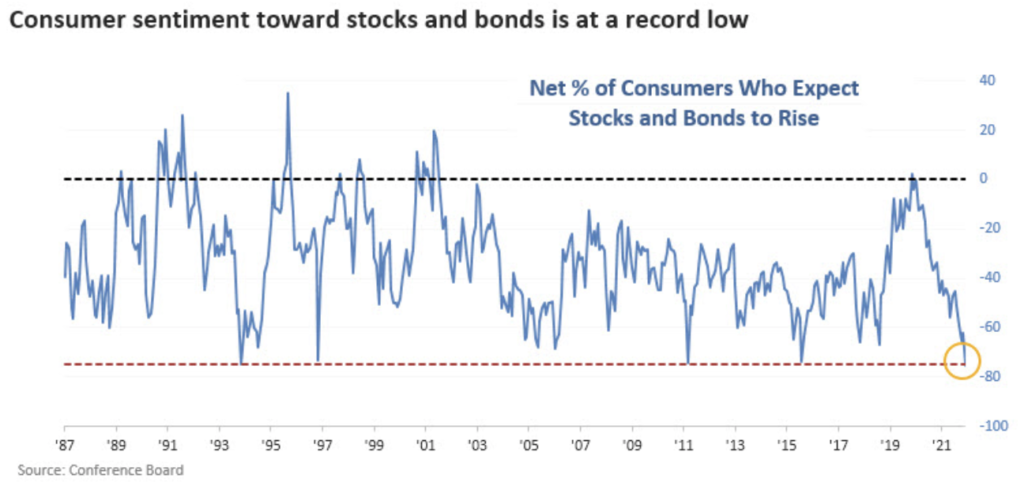 “In the U.S., households now hate stocks on a level rarely matched in 35 years. According to the Conference Board, the net percentage of consumers who expect stocks to rise versus fall is the lowest in over a decade. They hate bonds even more…”