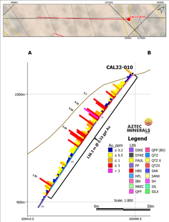 Reported lengths are apparent widths, not true widths, and the observed gold mineralization appears to be widely distributed in disseminations, fractures, and veinlets within quartz-feldspar porphyry, feldspar porphyry stocks, and related hydrothermal breccias. A section of CAL22-010 is shown below: