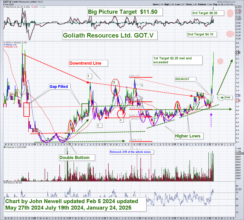 - First Target Reached: As of February 5, 2025, Goliath Resources (GOT.V) hit its first target of $2.25, exceeding it with strong momentum.