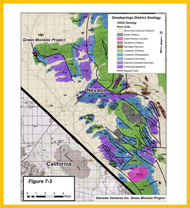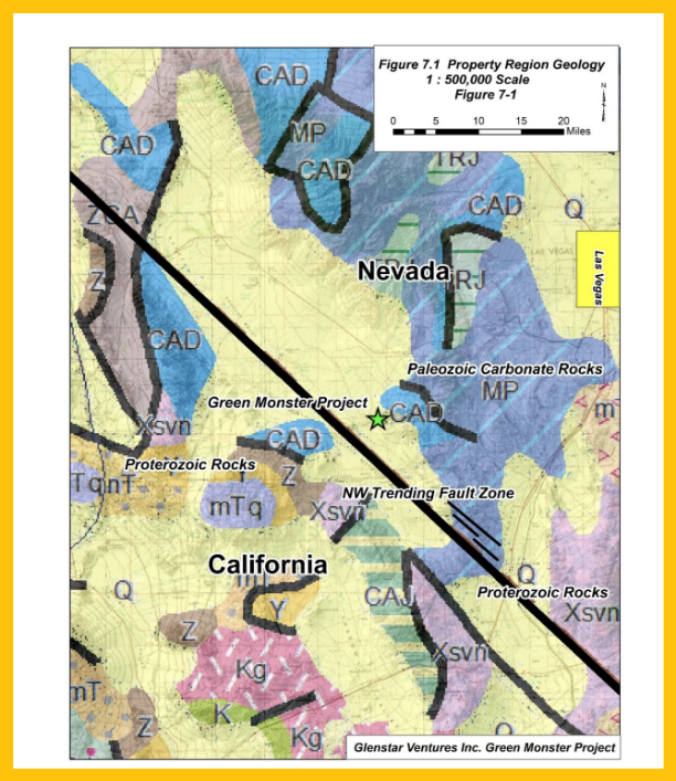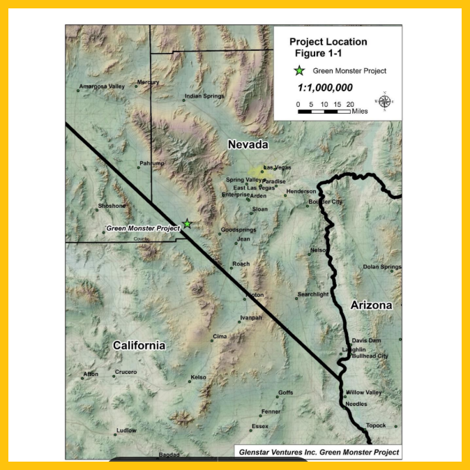 Glenstar’s flagship property, the “Green Monster,” is a Co-Ni-Cu-U mineral property that is centered on a high-grade, polymetallic mineralized property located only about 40 miles southwest of Las Vegas, Nevada.