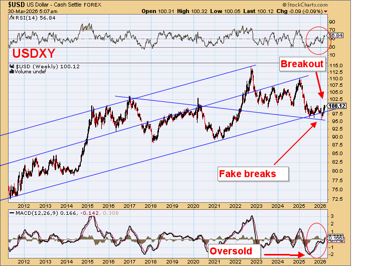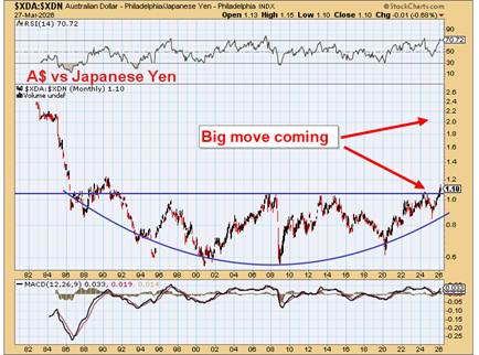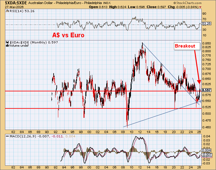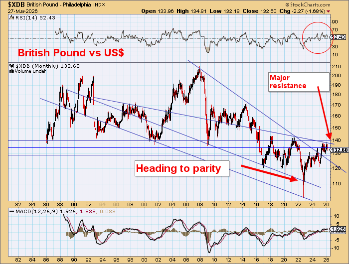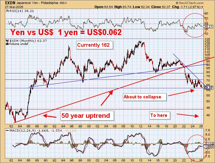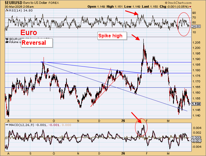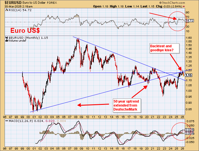 The Euro failed to break above its 50 year uptrend and has turned down to fall below parity and probably thereafter to its demise.