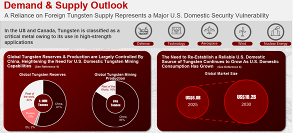 More than 60% of global tungsten reserves and approximately 84% of global production are controlled by China. Processing capacity is even more concentrated. In an environment of rising geopolitical tension and growing defense expenditures, this concentration represents a structural supply vulnerability for the United States.