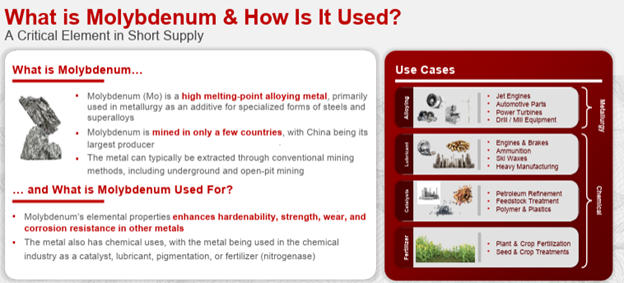 In addition to tungsten, the IMA system hosts molybdenum mineralization, a metal that carries its own strategic importance. Molybdenum is a high-melting-point alloying element used primarily to strengthen steel and superalloys, enhancing hardness, wear resistance, and corrosion resistance. It is essential in jet engines, power generation turbines, pipelines, automotive components, and heavy industrial manufacturing. Like tungsten, molybdenum supply is geographically concentrated, and its role in defense, energy infrastructure, and advanced manufacturing adds another layer of strategic relevance to the IMA project. While tungsten remains the primary focus, the presence of molybdenum provides additional metal exposure within the same mineralized system.