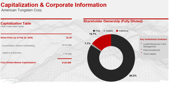 American Tungsten currently has approximately 49 million shares outstanding and a market capitalization in the range of CA$120 million. For a company advancing a past-producing critical metals asset with ongoing drilling and expanding targets, the structure remains relatively tight.