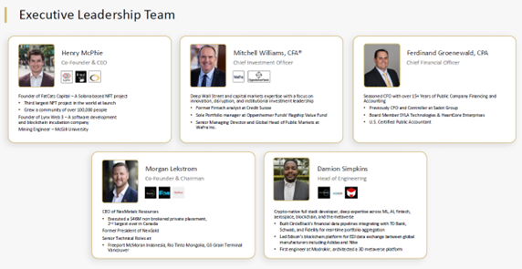 The company is led by co-founder and CEO Henry McPhie, a mining engineer by training with experience building and scaling digital assets and blockchain-based platforms. Chief Investment Officer Mitchell Williams, CFA, brings deep institutional experience from Credit Suisse, Oppenheimer Funds, and Wafra, where he served as Global Head of Public Markets. The board is chaired by Morgan Lekstrom, a resource executive with experience executing large financings and operating in complex commodity environments.