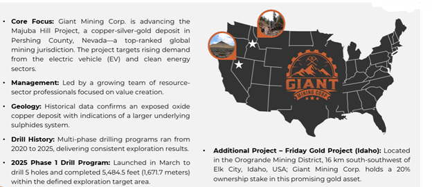 Giant Mining Corp. (CSE: BFG; OTC:BFGFF; FWB:YW5) is a U.S.-focused copper exploration company listed on the CSE, with its primary asset being the Majuba Hill Copper Project in Nevada.