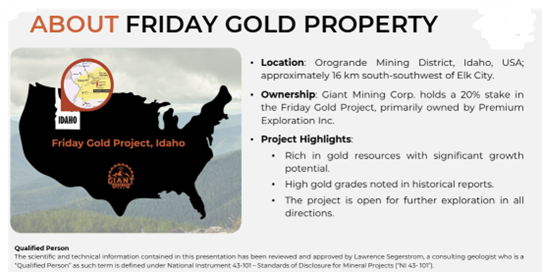 In addition to Majuba Hill, Giant Mining Corp. holds a 20% ownership interest in the Friday Gold Project, located in the Orogrande Mining District of Idaho, approximately 16 kilometres south-southwest of Elk City. The project is situated in a historically productive gold camp and hosts a historical NI 43-101 mineral resource estimate totaling more than 1.2 million ounces of gold across indicated and inferred categories at grades near 1.0 g/t gold, based on a 2013 technical report.