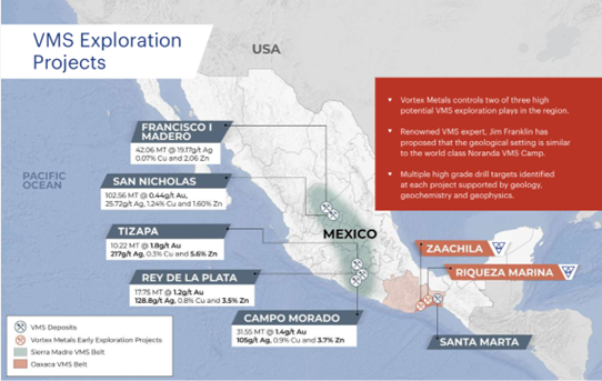 In addition to Chile, Vortex Metals controls several volcanogenic massive sulphide (VMS) exploration projects in Mexico.