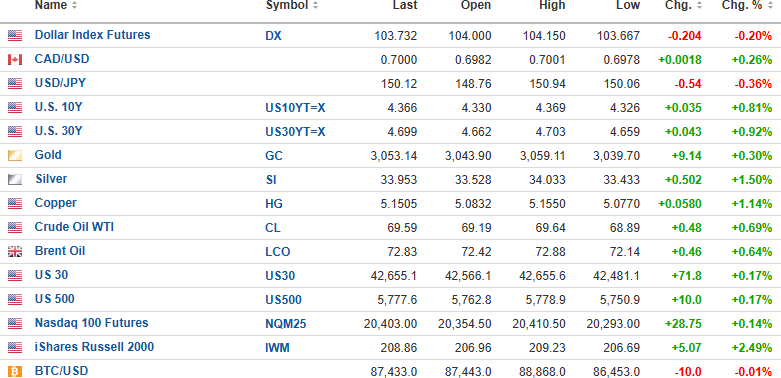 U.S. Dollar Index futures are down 0.20% to 103.732, while the 10-year bond yield is up 0.81% to 4.366%, and the 30-year bond yield is up 0.92% to 4.699%.
