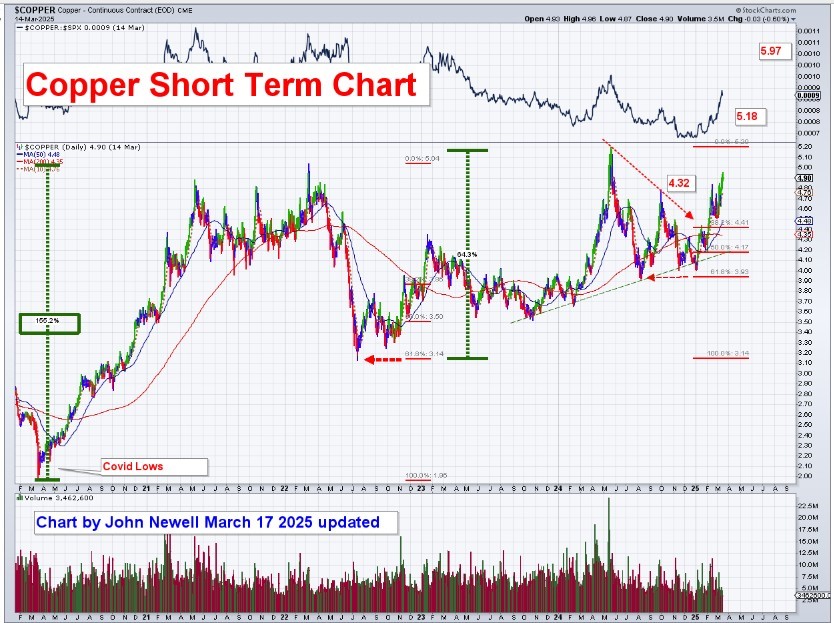 Copper’s immediate resistance levels are at $5.18 and $5.97, while strong support levels exist at $4.32 and $3.75. The short-term copper chart (Chart 1) shows that if copper breaks above $5.97/lb, it could trigger an acceleration toward $6.20/lb in 2025.