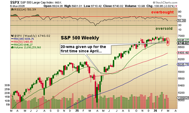 However way you wish to spin it, there was a weekly close below the 20-week moving average for the S&P 500 which is important because it has remained above that m.a. since it broke out above it last May. Combining the weekly breakdown with the second consecutive daily close below the 100-dma and it sure looks like stocks are finally headed lower.