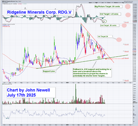 Ridgeline Minerals Corp. (RDG:TSX.V; RDGMF:OTCQB; 0GC0:FRS) closed for trading at CA$0.18, US$0.125 on July 22, 2025.