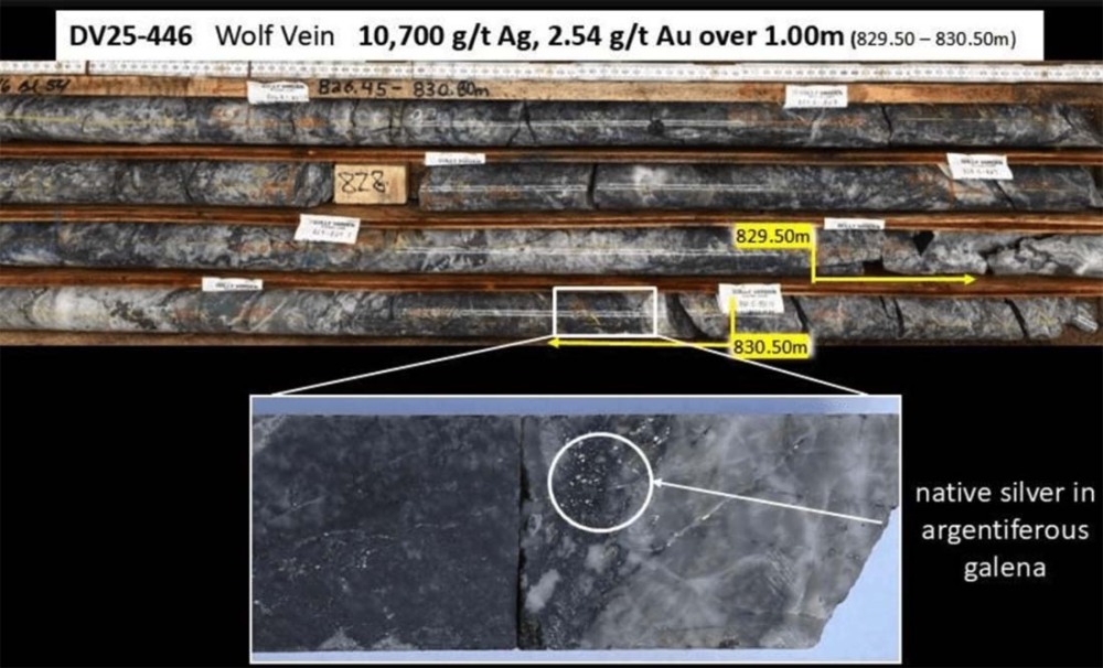 “These high-grade silver results over wide intervals suggest excellent continuity at the Wolf Vein,” Chief Executive Officer Shawn Khunkhun said. “The mineralization in drill hole DV25-446 includes abundant native silver and is consistent with the robust style of mineralization with a significant increase in associated gold and base metal values. Additional drilling at Wolf is being prioritized for the remainder of the season.”