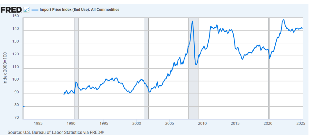 Import prices have been pretty flat since the 2022/23 energy price rise and then correction. Not the rise from 2003 to 2008, which was commodity-driven. Commodity prices can have a big effect on import prices. If these prices rise in a slowing economy, that is bad news, more stagflation.