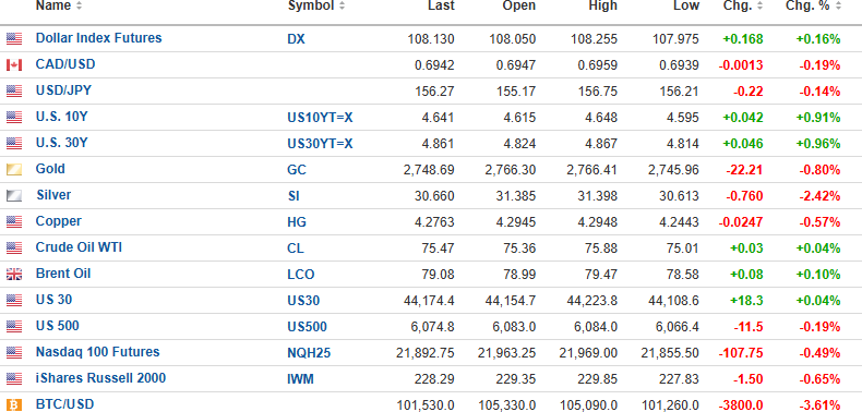 USD dollar index is up 0.16% to 108.130 this morning, with the 10-year yield up 0.91% to 4.641% and the 30-year yield up 0.96% to 4.861%.