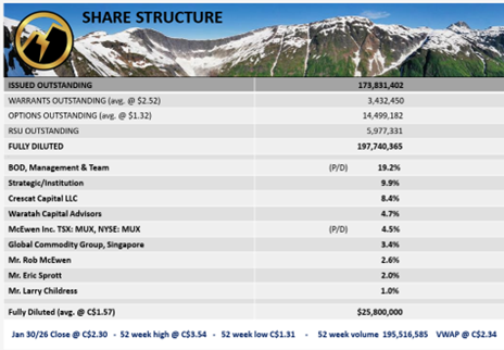 Management and board ownership remain near 19% of the issued share base, with strong participation from strategic and institutional holders, including Crescat Capital, McEwen Inc. (MUX:TSX; MUX:NYSE), Waratah Capital, Global Commodity Group, Rob McEwen, Eric Sprott, and others. This concentrated ownership profile often reduces volatility while concentrating leverage to positive exploration outcomes and rerating triggers.