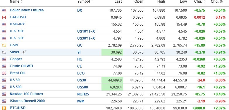 Gold (+0.57%), silver (+0.91%), oil (+1.26%), and copper (+0.63%) are all higher. Stock index futures are mixed, with the DJIA (-0.05%) down 24 points, but the S&P 500 (+0.27%) is up 16.1 points, and the NASDAQ (+0.40%) is up 85.75 points.