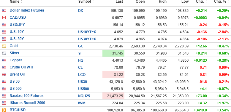 USD dollar index is up 0.20% to 109.130 this morning, with the 10-year yield down 2.84% to 4.652% and the 30-year yield down 2.13% to 4.879%.
