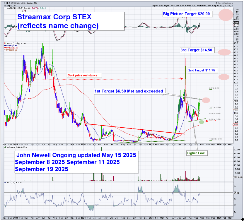 John Newell of John Newell & Associates shared an updated chart on Streamex Corp. (STEX:NASDAQ) after it met his initial target.