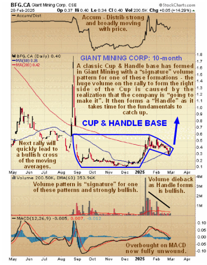 We are looking at Giant Mining Corp. (CSE: BFG; OTC:BFGFF; FWB:YW5) again here because it is right now completing a big Cup & Handle base pattern and on Friday it started moving up sharply on the growing realization of the positive implications of the tariff barriers for domestic U.S. copper companies like Giant Mining.