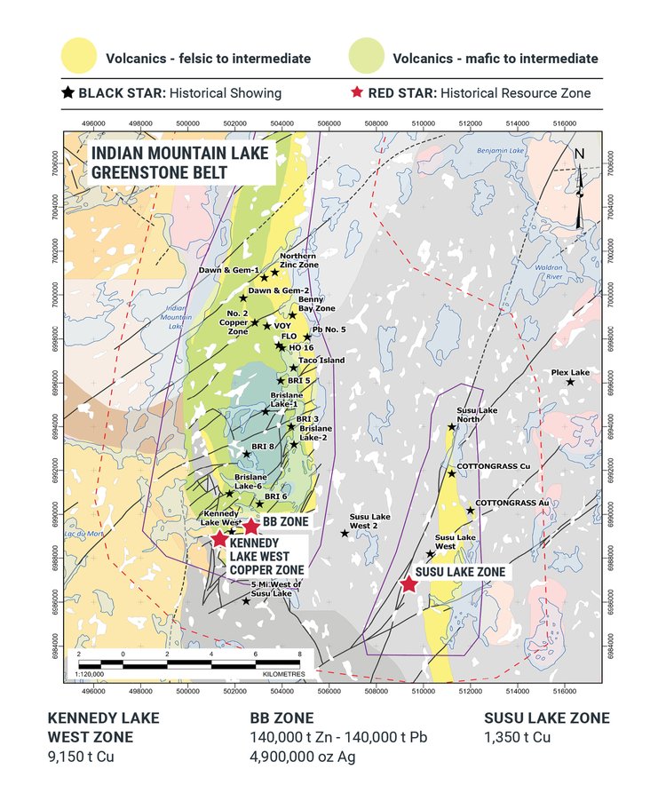 About 900 meters west of BB, the Kennedy Lake West Zone has a historical resource of 610,000 tons grading 1.15% copper. And 8 kilometers southeast of BB is the Susu Lake Zone, consisting of a historical resource of 142,500 tons grading 0.95% copper.