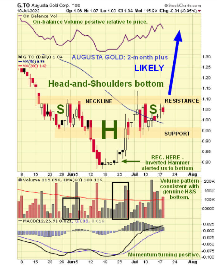 While no technical pattern can be relied on 100% to lead to an expected outcome, due to the complex and sometimes unpredictable fundamental factors in play, they do indicate probabilities, and the reason for focusing on Augusta Gold Corp. (G:TSX.V: AUGG:OTCQB) here just a couple of days after we looked at its 1-year chart in the CHART ANALYSIS OF ALL THE HUI INDEX CONSTITUENTS posted on the 16th is to draw your attention to the particularly fine example of a Head-and-Shoulders bottom that is completing in the stock that we can see much more clearly on the 2-month plus chart shown below.