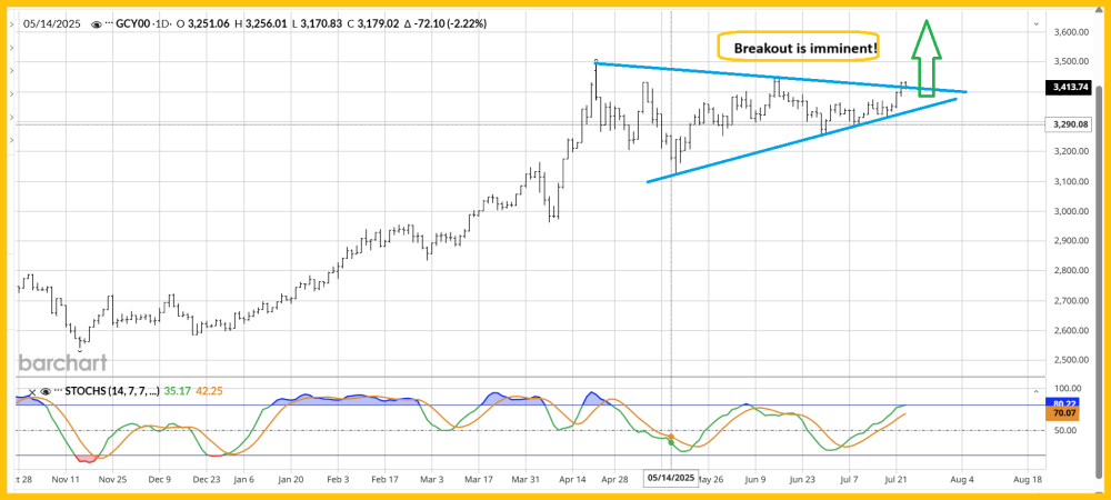 A symmetrical triangle pattern breakout appears imminent, and the target of this pattern is about $3800.
