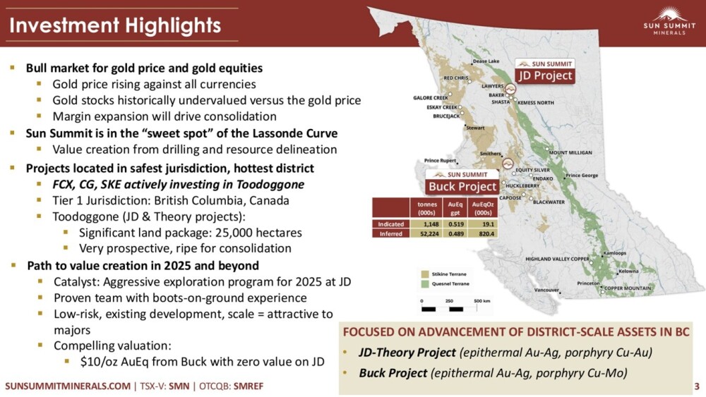 Sun Summit Minerals Corp. (SMN:TSXV; SMREF:OTCQB) is regarded as an outstandingly attractive gold stock because the company is advancing two substantial gold projects in mining-friendly British Columbia, and it is in the “sweetest spot” of what is known as the Lassonde Curve.