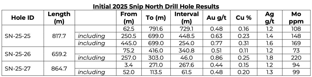 These holes are part of a 12,000-meter drilling program aimed at expanding zones of intense potassic alteration and associated mineralization discovered in 2024, the company said in a release. Each of the first three holes successfully extended the mineralized footprint of Snip North at its Iskut project in British Columbia’s Golden Triangle, intersecting broad intervals of porphyry-style mineralization with notable copper and gold grades.