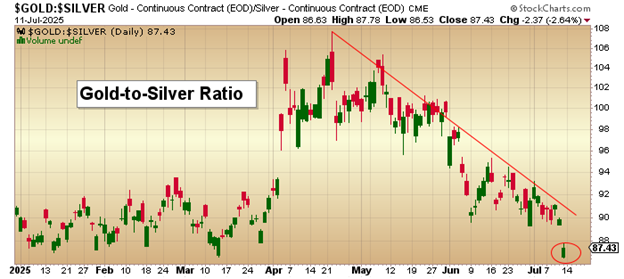 Contributing to this week’s fine silver action was the performance of copper which hit a record high of US$5.8955 after the Trump Administration announced a 50% tariff on all imported copper products which was a clear message to the liberal-left, tree-hugging woke-ites that if they continue to deny permits for exploration and development for the copper companies, the price of all copper-sensitive products including refrigerators, cell phones, EV’s, and toasters will all be marked higher which is not exactly the optimum preferred course for keeping a lid on inflation.