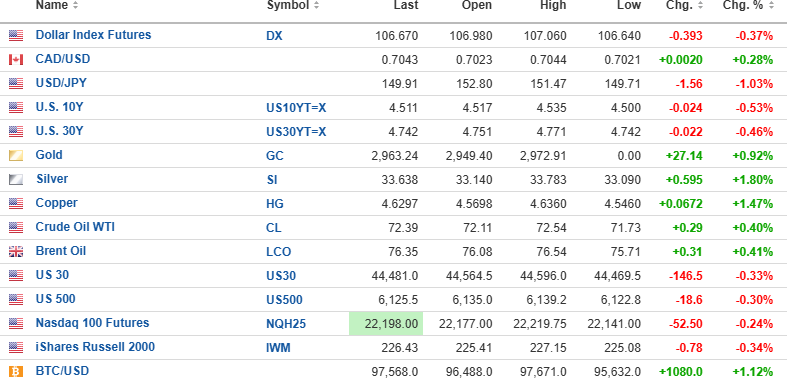 USD index futures are down 0.37% to 106.670, with the 10-year yield down 0.53% to 4.511% and the 30-year down 0.46% to 4.742%.