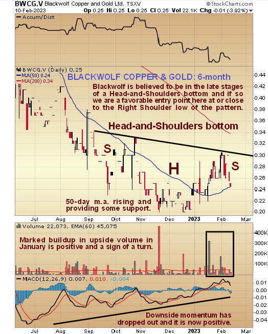 Blackwolf Copper & Gold is therefore rated an immediate strong speculative Buy here. Blackwolf trades in light volumes on the US OTC market where volumes should improve if a bull market takes hold as expected. Limit orders should always be employed in this market.