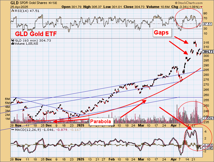The Gold ETF GLD shows the gaps from movements out of U.S. hours, but these will still need to be filled, and US$ Gold should retreat to retest the parabola.