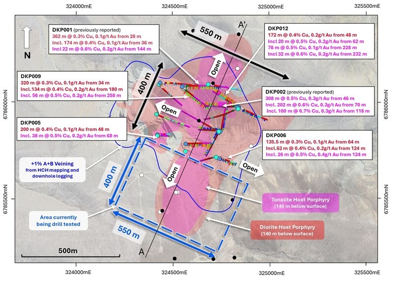 Discovery hole: DKP002 308m of 0.5% copper + 0.3g/t gold, including 202m of 0.6% copper + 0.3g/t gold, and including 100m of 0.7% copper + 0.3g/t gold.