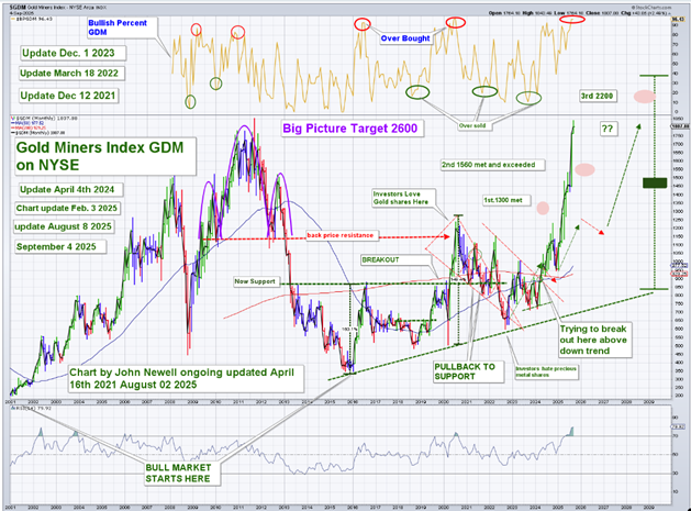 Broke out of a multi-year range, retested resistance, and accelerated. Targets at 1,300 and 1,560 have already been met. The next waypoint is 2,200, with a longer-term objective near 2,600. That is how secular turns unfold: breakout, confirm, continue higher.