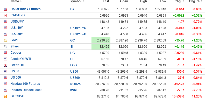 The U.S. dollar Index futures are lower by 0.644% to 106.025, with the 10-year yield down 1.08% to 4.135% and the 10-year yield down 0.36% to 4.448%.
