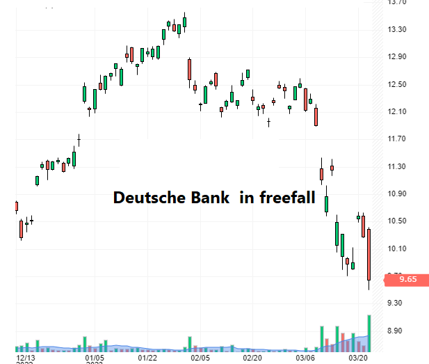 Right on the heels of that fiasco arrives the even-greater plight of Swiss investment banking giant Credit Suisse, and after the powers that be conspire to throw them under a bus with a forced US$3.25 billion buyout by UBS, they now have to deal with another extremely delicate situation with news that Germany’s Deutsche Bank is also now having liquidity issues.