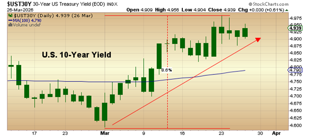 Stocks have been declining due to fear over the inflationary impact of $100 oil which explains the reason the bond vigilantes have taken bond yields sharply higher. If rising energy costs are expected to throw the world economy into a recession, it is instructive to examine the reason yields are not declining in sympathy with lower global GDP. The reason is somewhat more insidious than simply “bonds fearing inflation”. It revolves not around the idea of one’s “return on investment” but rather the “return OF investment, as in one’s principal. They estimate that it costs the U.S. government $1 billion per day to fund the current war effort in Iran so with interest payments on debt now exceeding the U.S. defense budget, how much longer can a technically insolvent country maintain its role as global policeman?