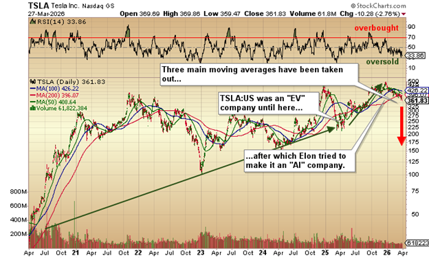 Fast forward to March 2026 where the “AI” stocks were trashed violently right up until the final bell on the final trading day. With the new TSLA:US narrative now “AI” and robotics, what is the pivot to which Elon turns? Back to electric vehicles where China’s BYD is eating their lunch?