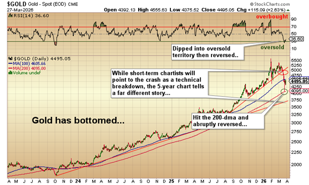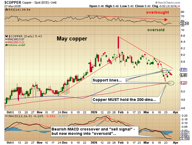 As for the precious metals, I have been using the $4,400 level for April gold as my re-test level of support since the $5,200 level but after knifing down through $4,400 during the March 22nd crash to the 200-dma at $4,127 a week ago, it has since recovered back above $4,400. As I wrote earlier in this missive, the cessation of selling pressure on Friday was a surefire indication that once again, gold served its purpose of anchoring portfolios against severe drawdowns which means that the de-leveraging process has largely run its course.
