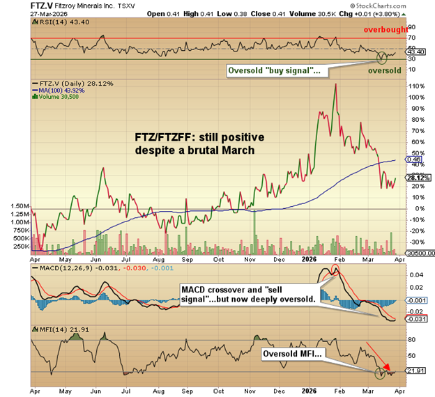 I also added to Fitzroy Minerals Inc. (FTZ:TSX.V; FTZFF:OTCQB)whose management group closed a CAD $21 million financing on March 23, the day after copper bottomed. It was an enormous testimonial to that management group that they closed it at $.50 per unit with the stock closing at CAD $.385 that day.