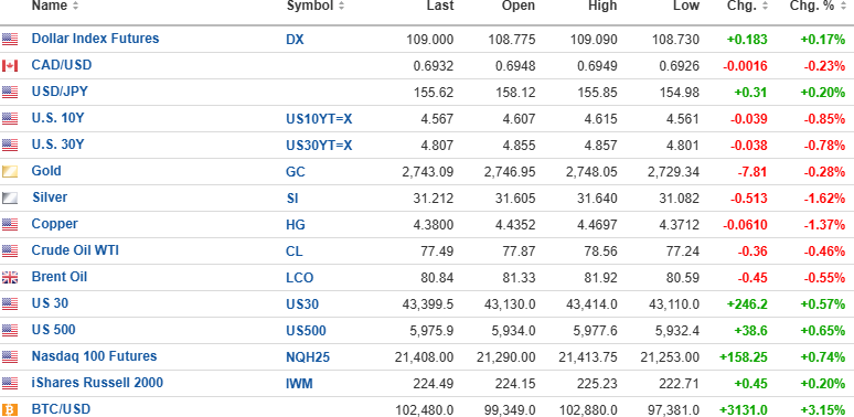USD dollar index is up 0.17% to 109.130 this morning with the 10-year yield down 0.85% to 4.567% and the 30-year yield down 0.78% to 4.807%.